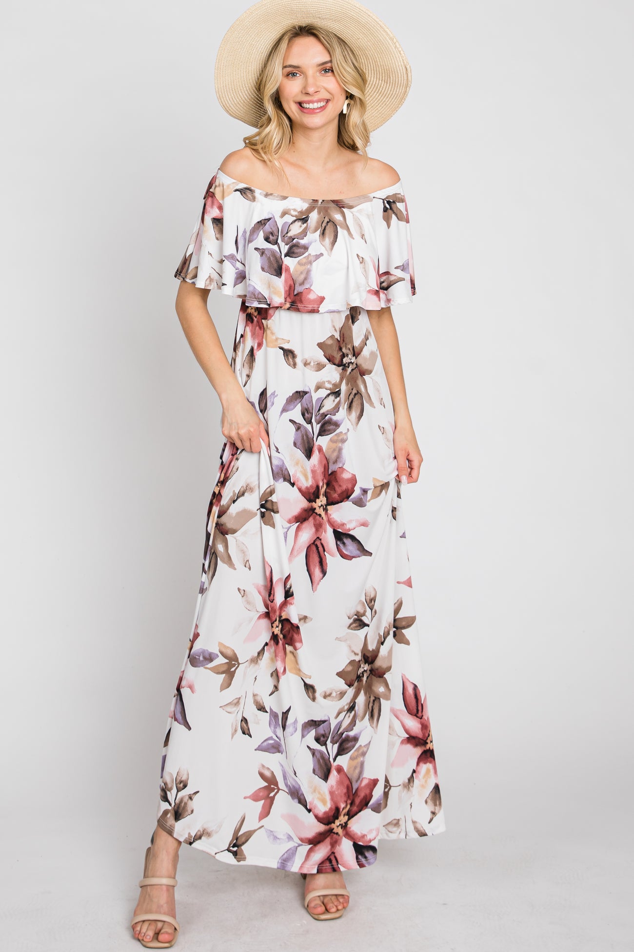 Ivory Floral Off Shoulder Maxi Dress