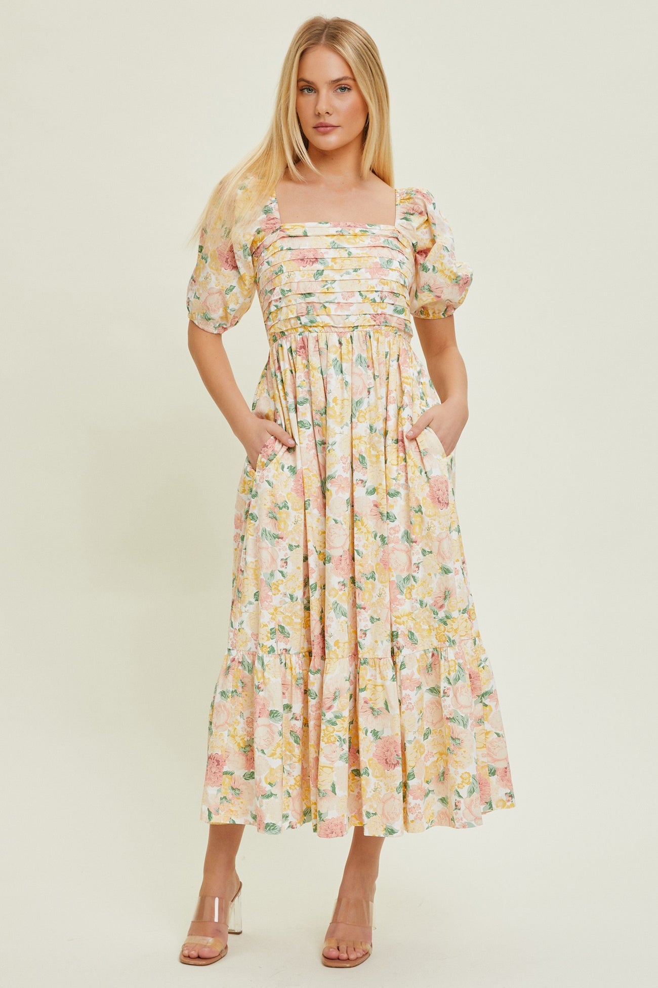 Ivory Floral Pleated Puff Sleeve Maternity Midi Dress