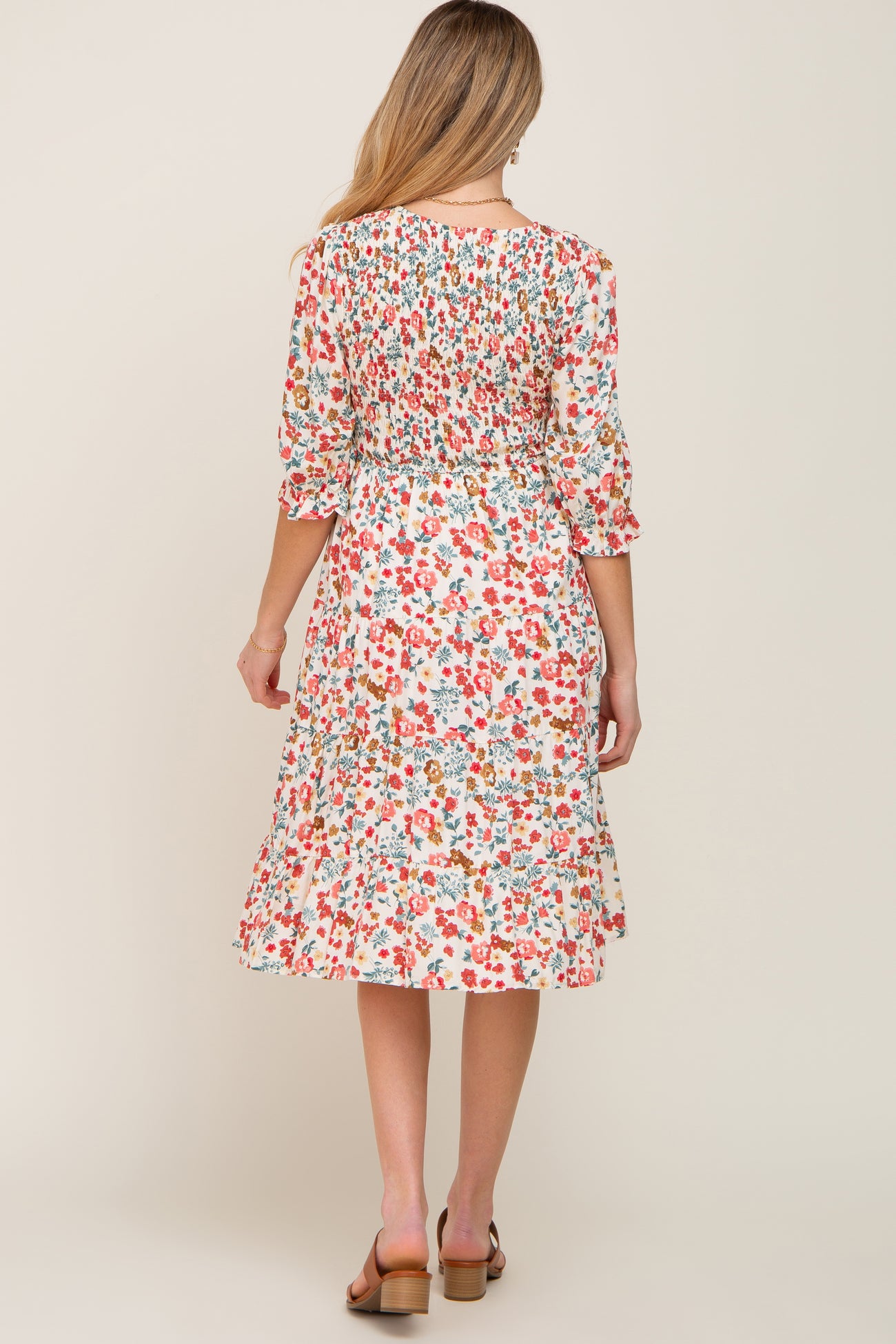 Ivory Floral Smocked Tiered Ruffle Maternity Dress