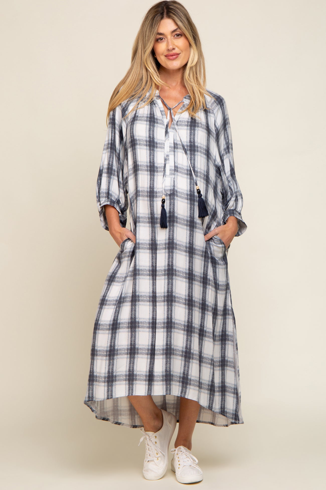 A plaid maternity midi dress with a split v-neckline, a front tassel tie, 3/4 length sleeves, side pockets, a side slit, and a hi-lo hem.