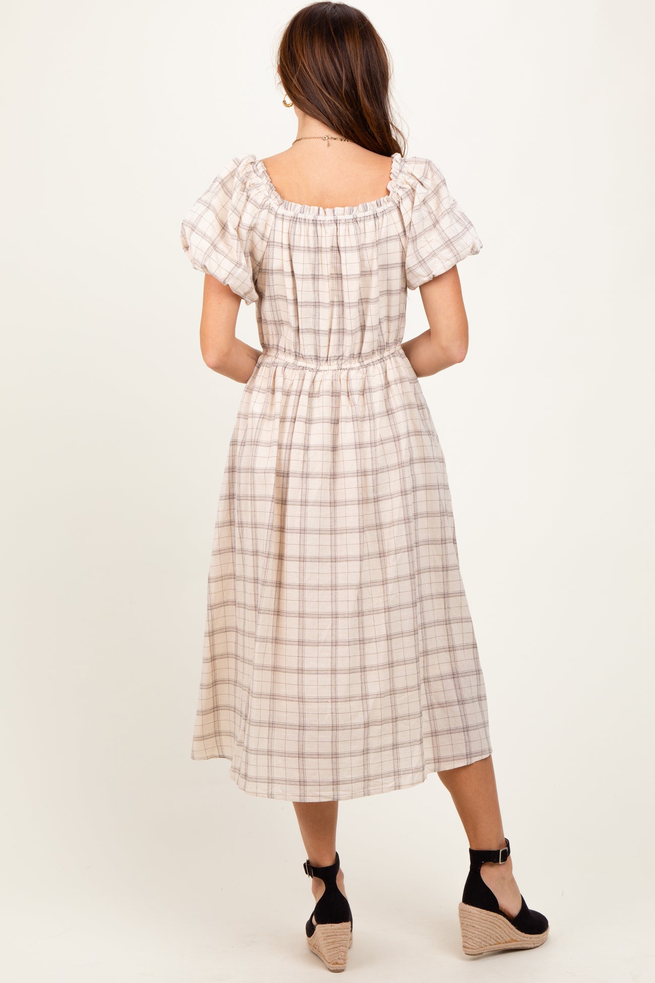 Embrace comfort and style with our Ivory Plaid Square Neck Maternity Midi Dress. Designed to flatter your growing bump, this dress features a chic square neckline and puffed short sleeves for a trendy touch. The soft ivory fabric is adorned with subtle plaid patterns, creating an effortlessly elegant look. The elasticized waist provides a gentle, comfortable fit while highlighting your silhouette. Perfect for any occasion, its midi length ensures ease of movement and versatility. Complete with convenient side pockets and crafted from breathable material, this dress keeps you comfortable all day long. Ideal for expectant moms who want to stay fashionable without compromising on comfort. Pair with sandals or wedges for a polished, casual vibe.