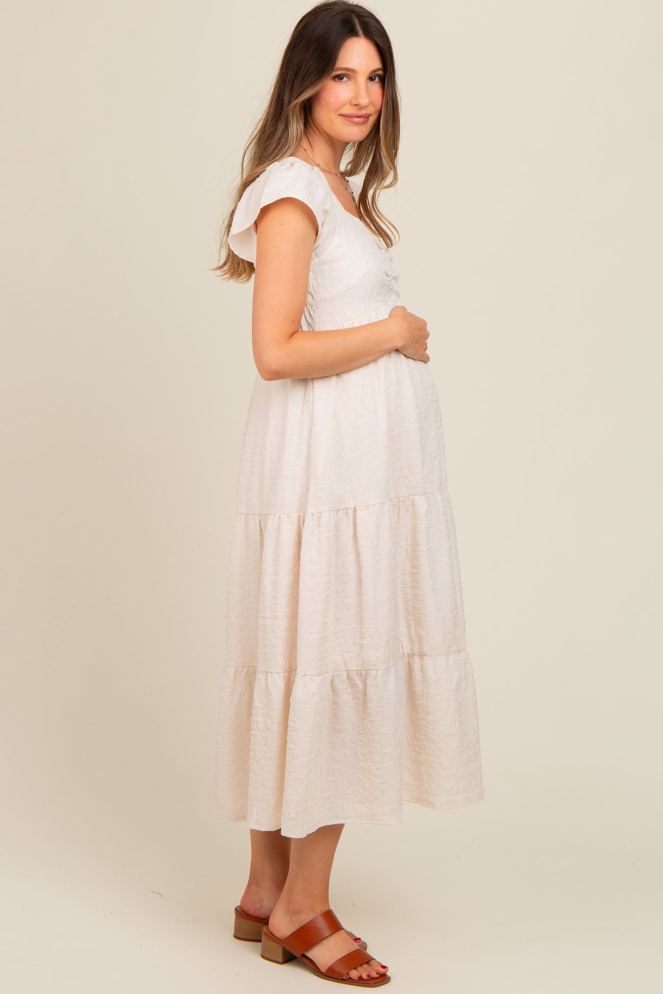 Ivory Textured Sweetheart Neck Short Puff Sleeve Tiered Maternity Midi Dress