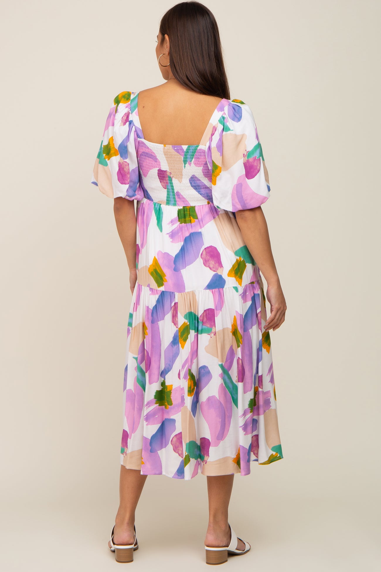 A watercolor print maternity midi dress with a squared neckline, short puff sleeves, a smocked back, and a tiered skirt. Dress is lined.