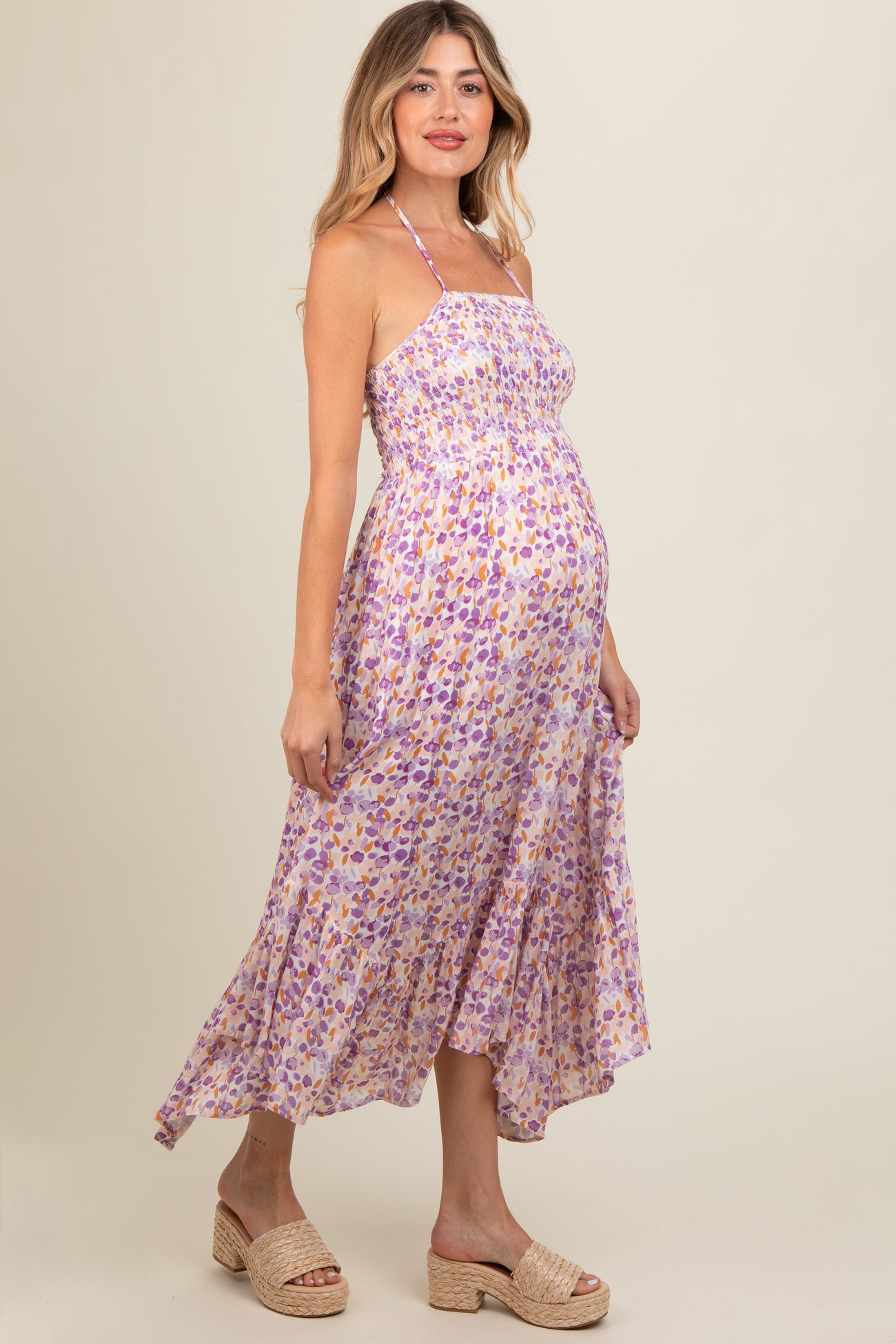 Lavender Floral Smocked Halter Flowy Maternity Maxi Dress