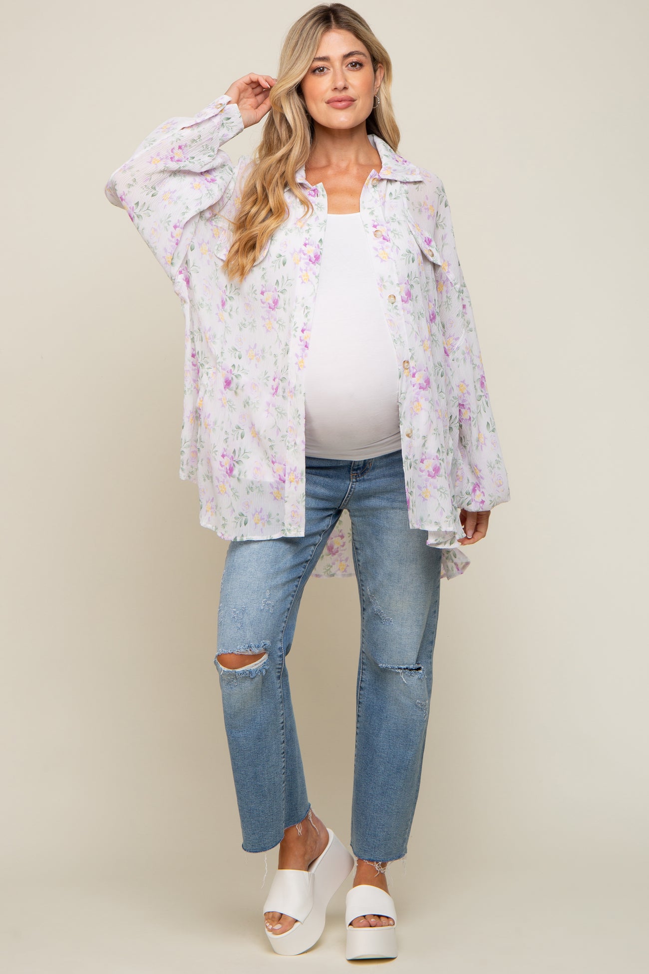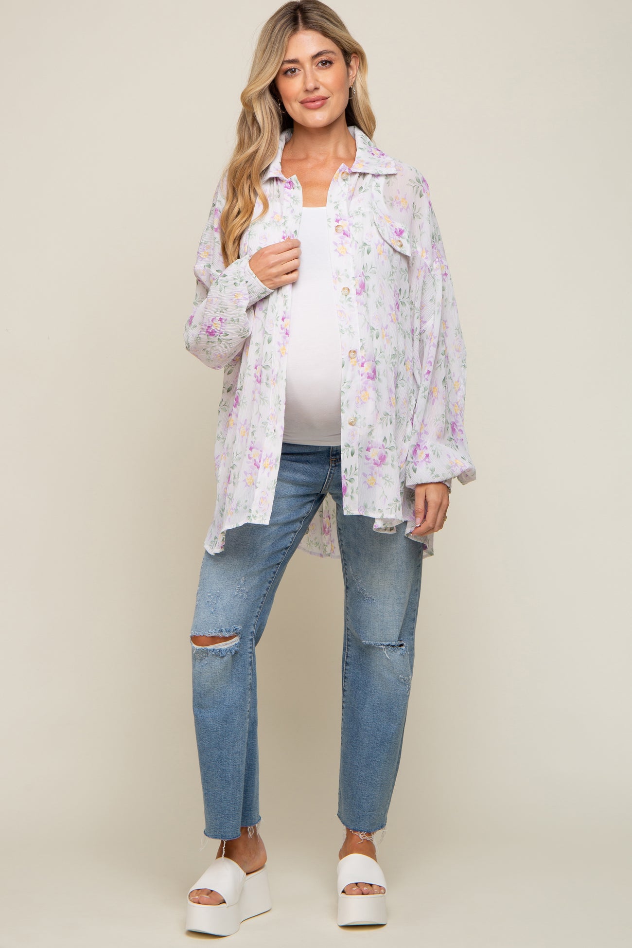 Details A floral print pleated maternity blouse in an oversized fit. Features collared neckline, button front closure and two faux chest pockets. Top is semi sheer. Content + Care