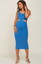 A sleeveless printed maternity dress featuring a tiered body, self-tie shoulder straps, a self-tie back, a back zipper and a square neckline.