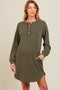A solid ribbed maternity dress with a round neckline and ruffle sleeves.