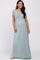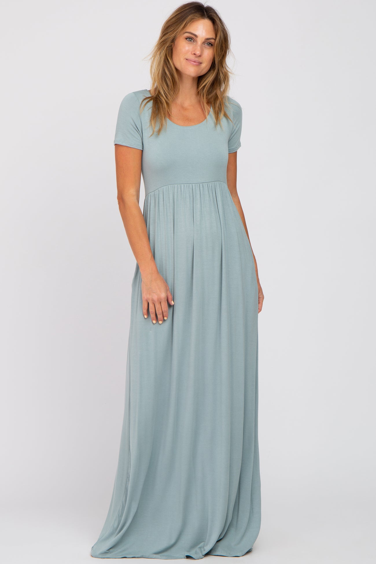 A solid short sleeve maternity maxi dress with a round neckline and hidden side pockets.