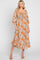 A floral print midi dress featuring a square neckline with ruffle trim, an adjustable front tie, a smocked elastic top, 3/4 length puff sleeves and a ruffle hem.