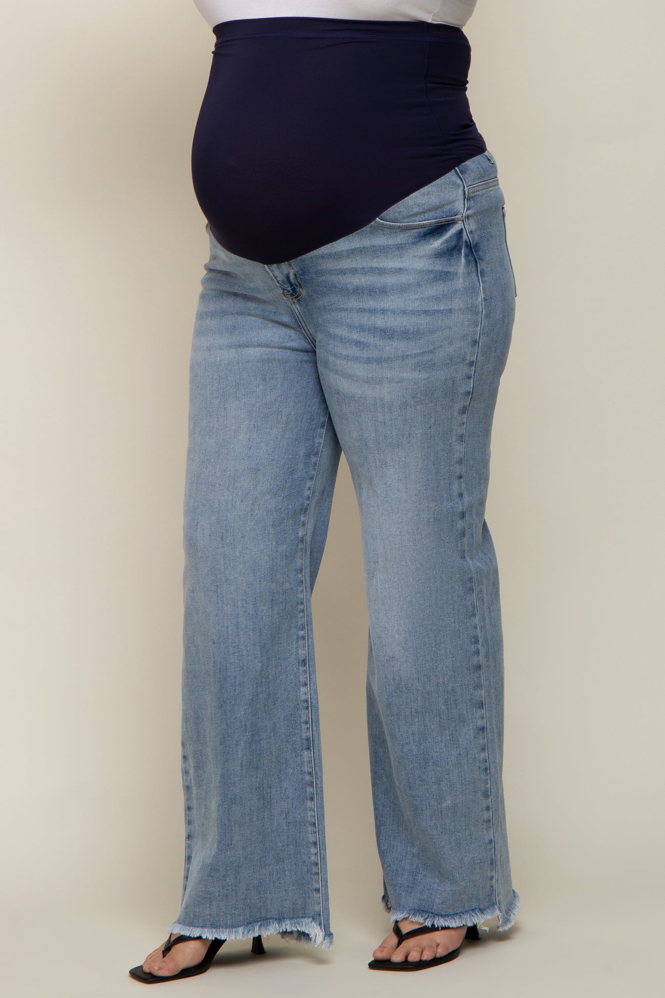 A light wash pair of maternity plus jeans with a light distressing and fringe hem. Includes five pockets and full panel elastic bellyband. Material has medium stretch.