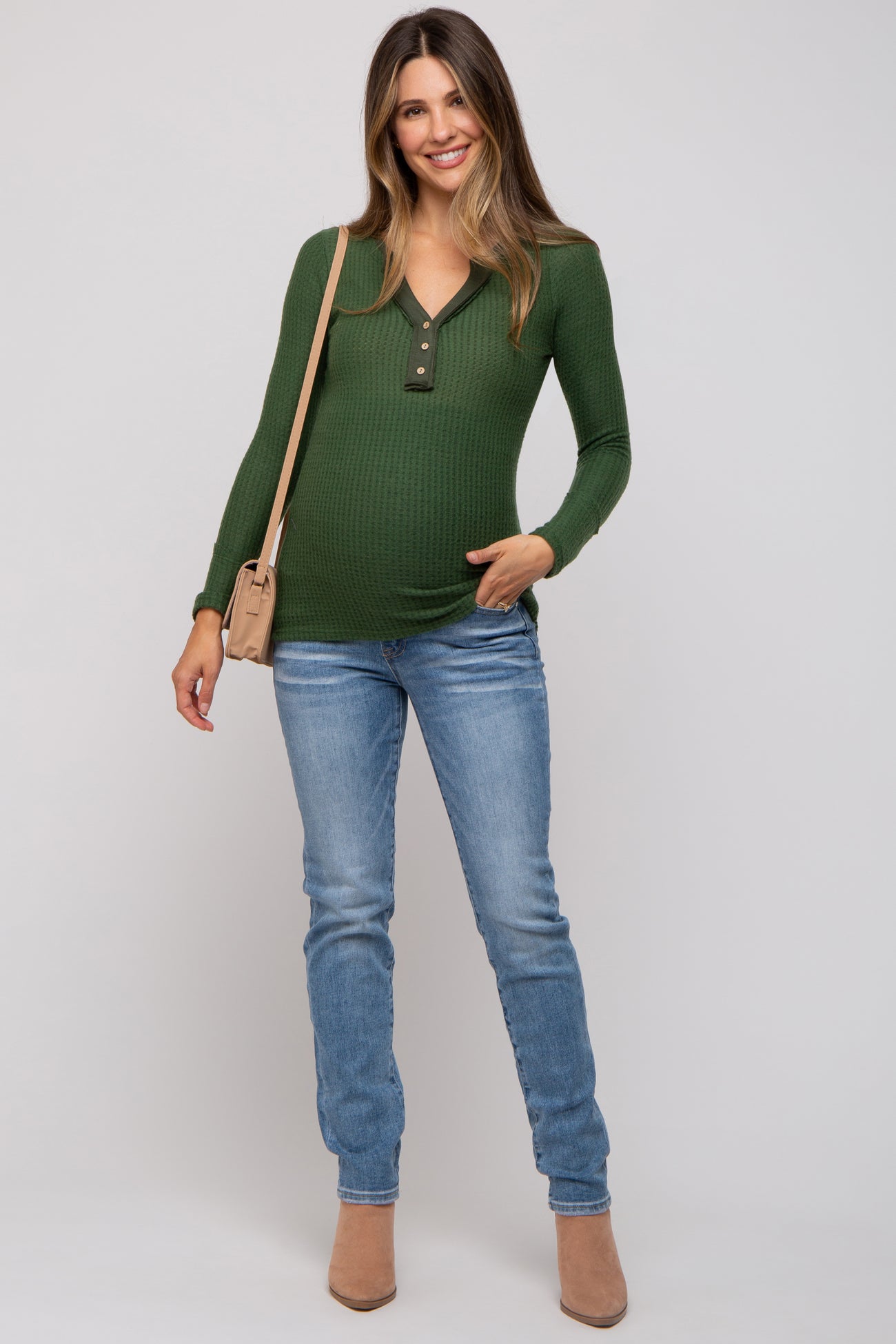 A pair of light wash maternity jeans featuring a belly band, 5 pockets, and skinny legs.