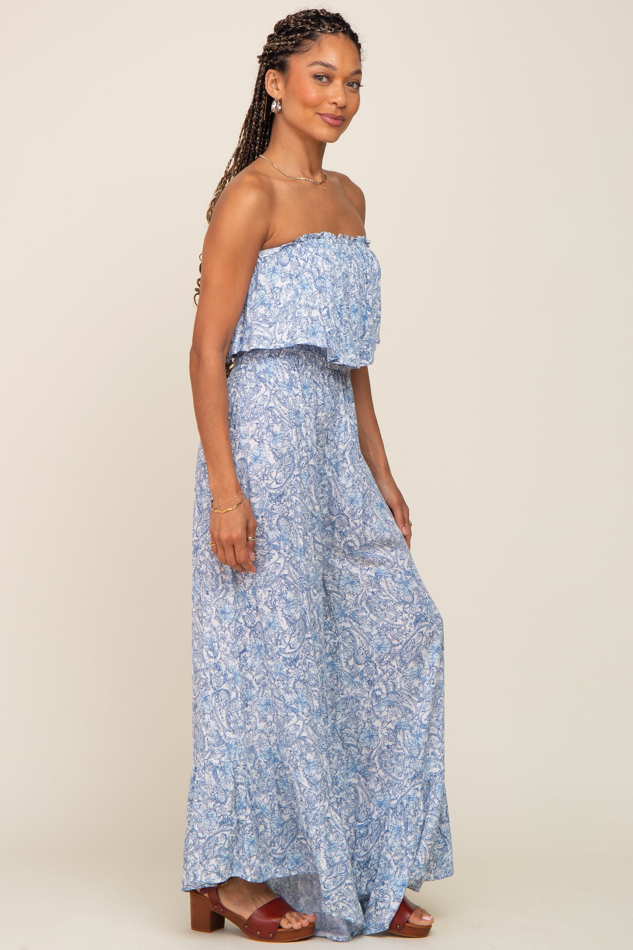 Light Blue Paisley Ruffle Strapless Jumpsuit