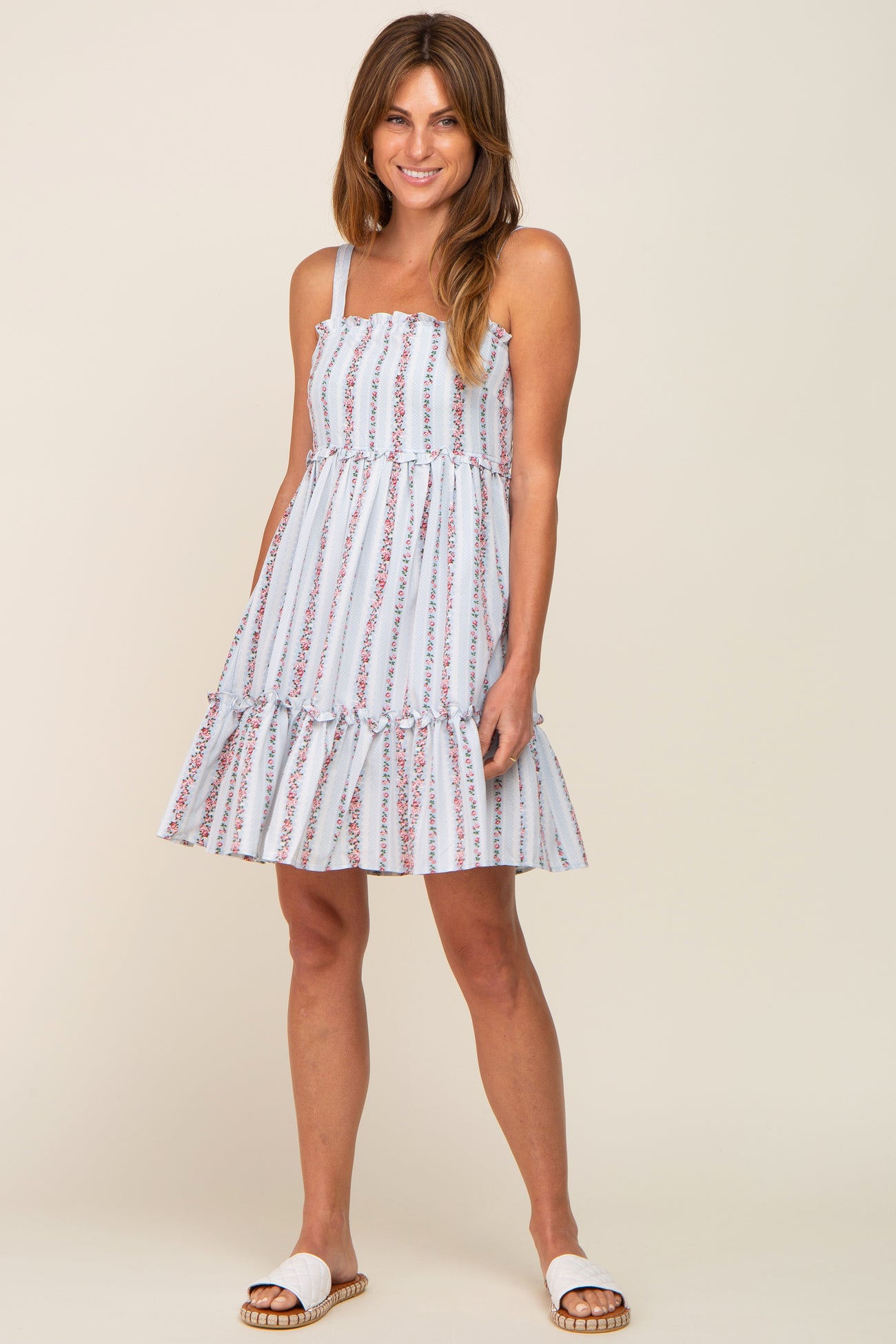 Light Blue Striped Floral Sleeveless Tiered Dress