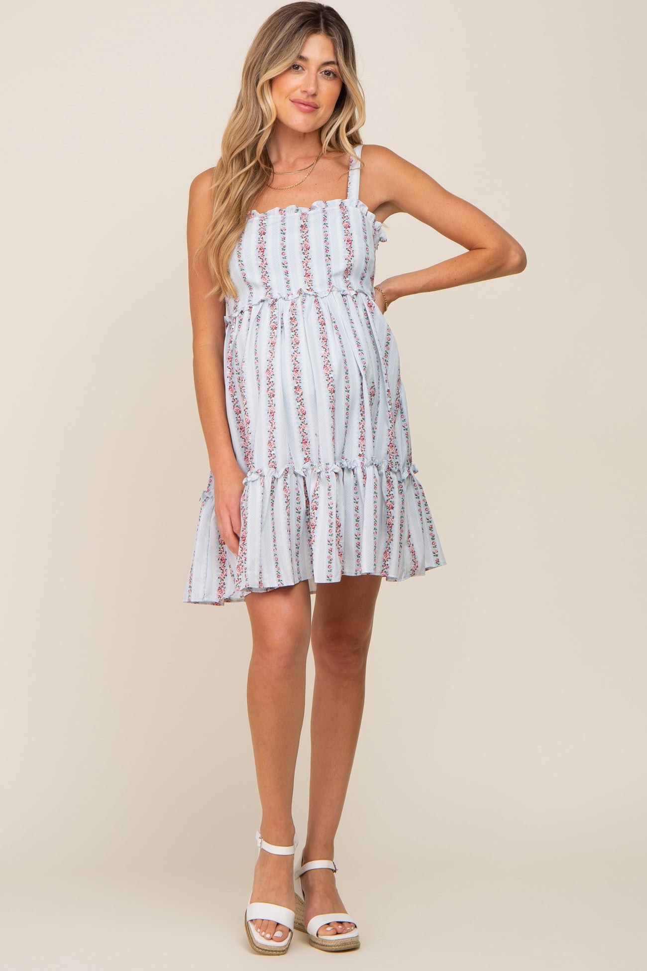 Light Blue Striped Floral Sleeveless Tiered Maternity Dress