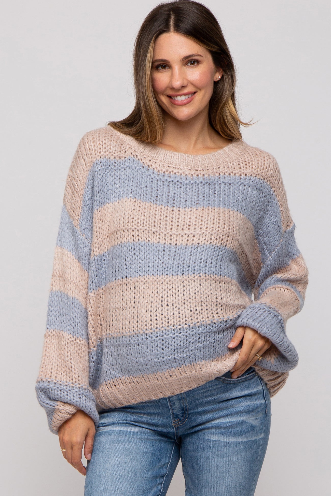 A knit striped maternity sweater featuring long sleeves and a rounded neckline.