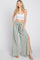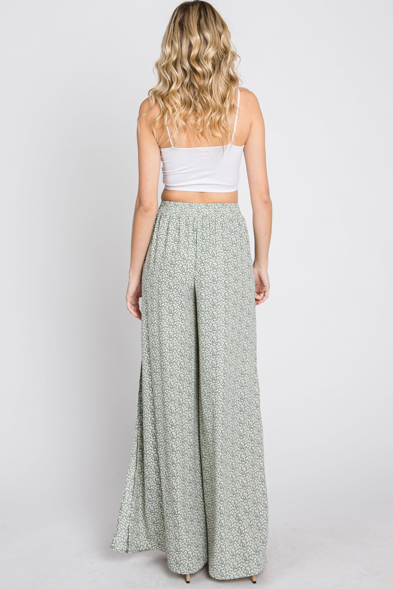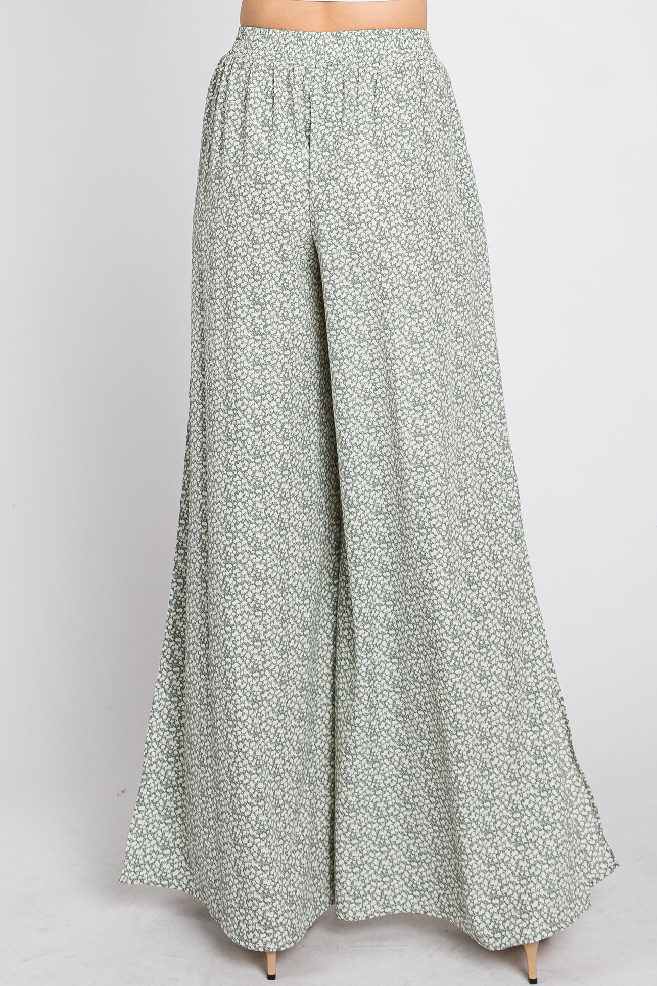 A pair of ditsy floral wide leg pants with an elastic waistline, a front tie, side pockets, and side slits.