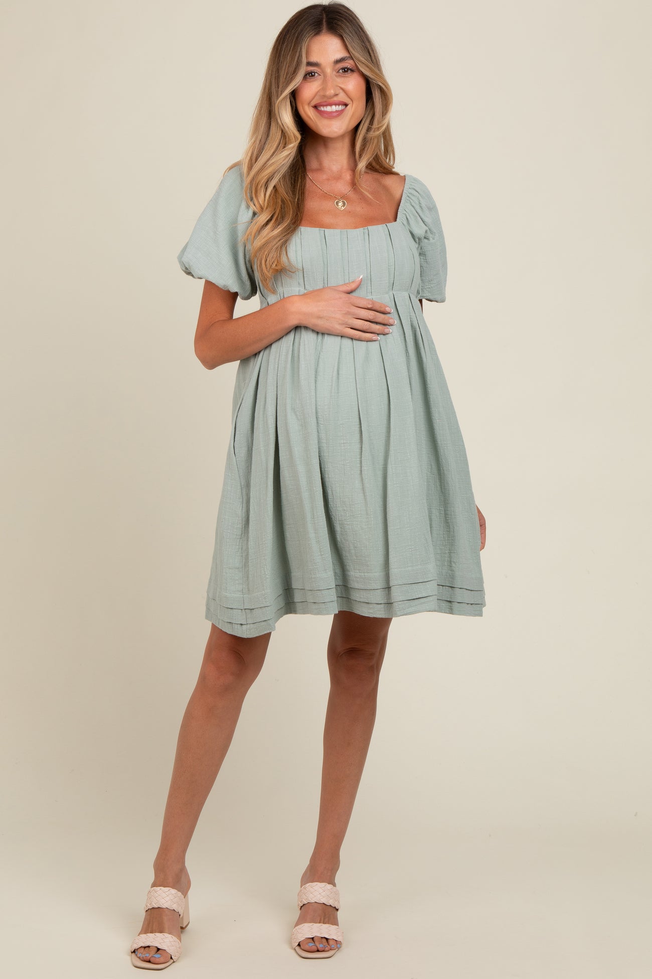 Light Olive Puff Sleeve Layered Hem Maternity Dress