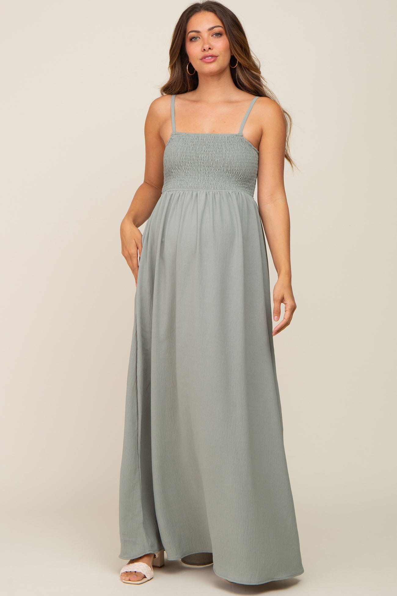 Light Olive Smocked Sleeveless Maternity Maxi Dress
