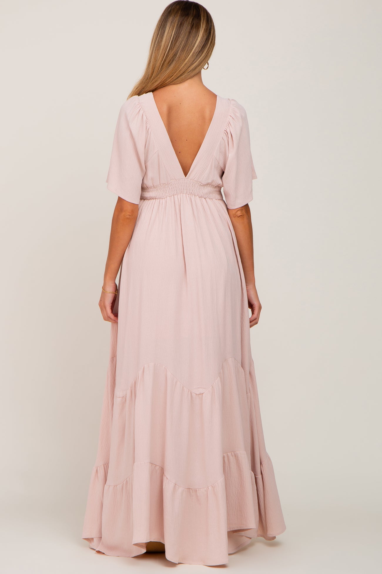 Light Pink Deep V-Neck Maternity Maxi Dress