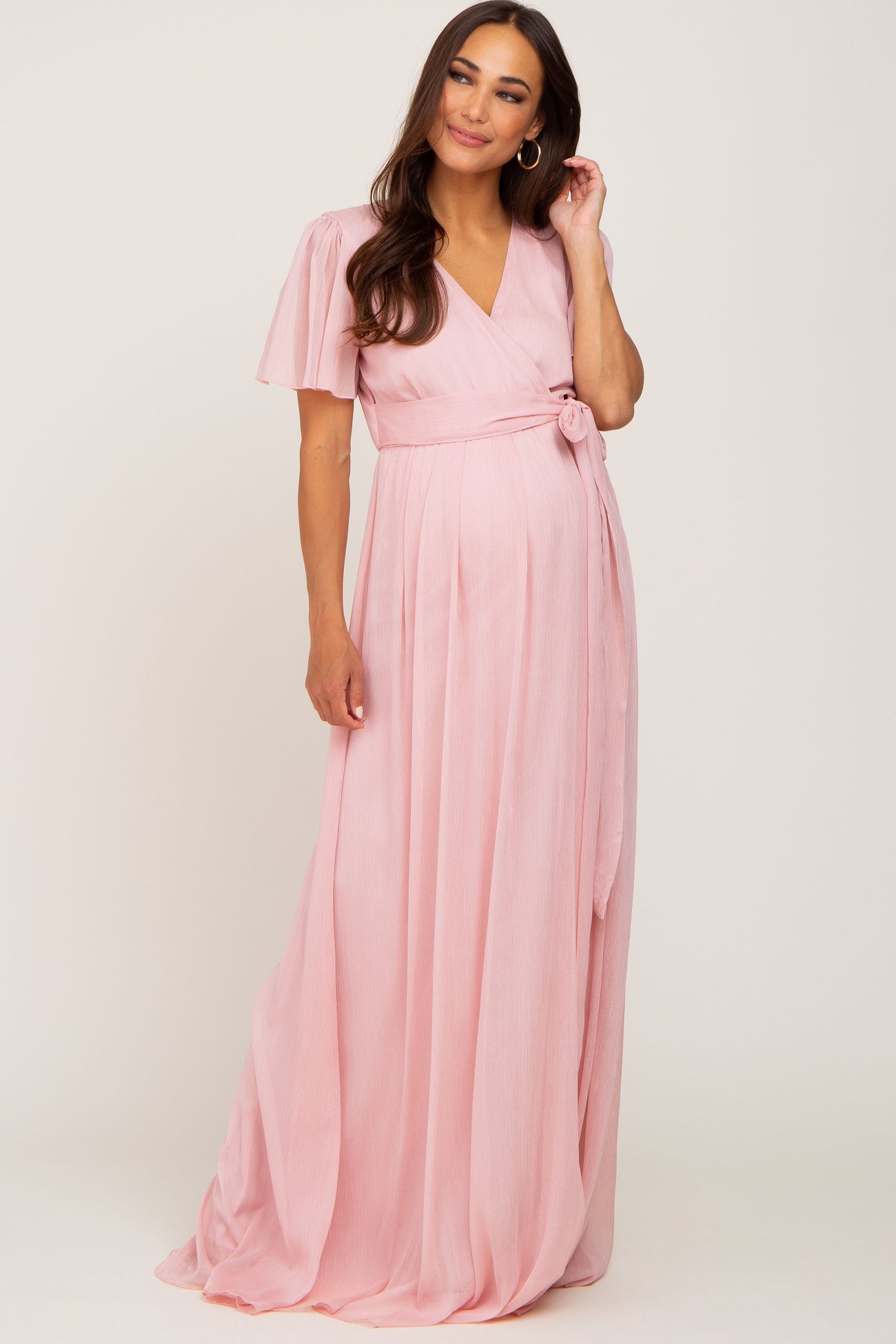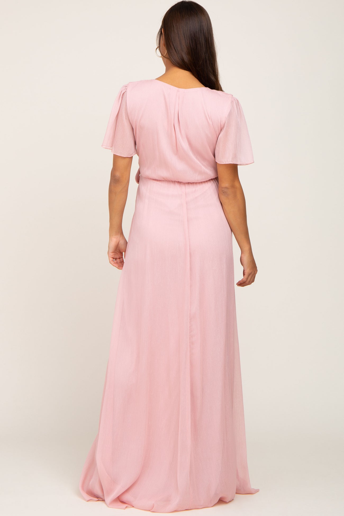 Light Pink Metallic Shimmer Chiffon Maternity Maxi Dress