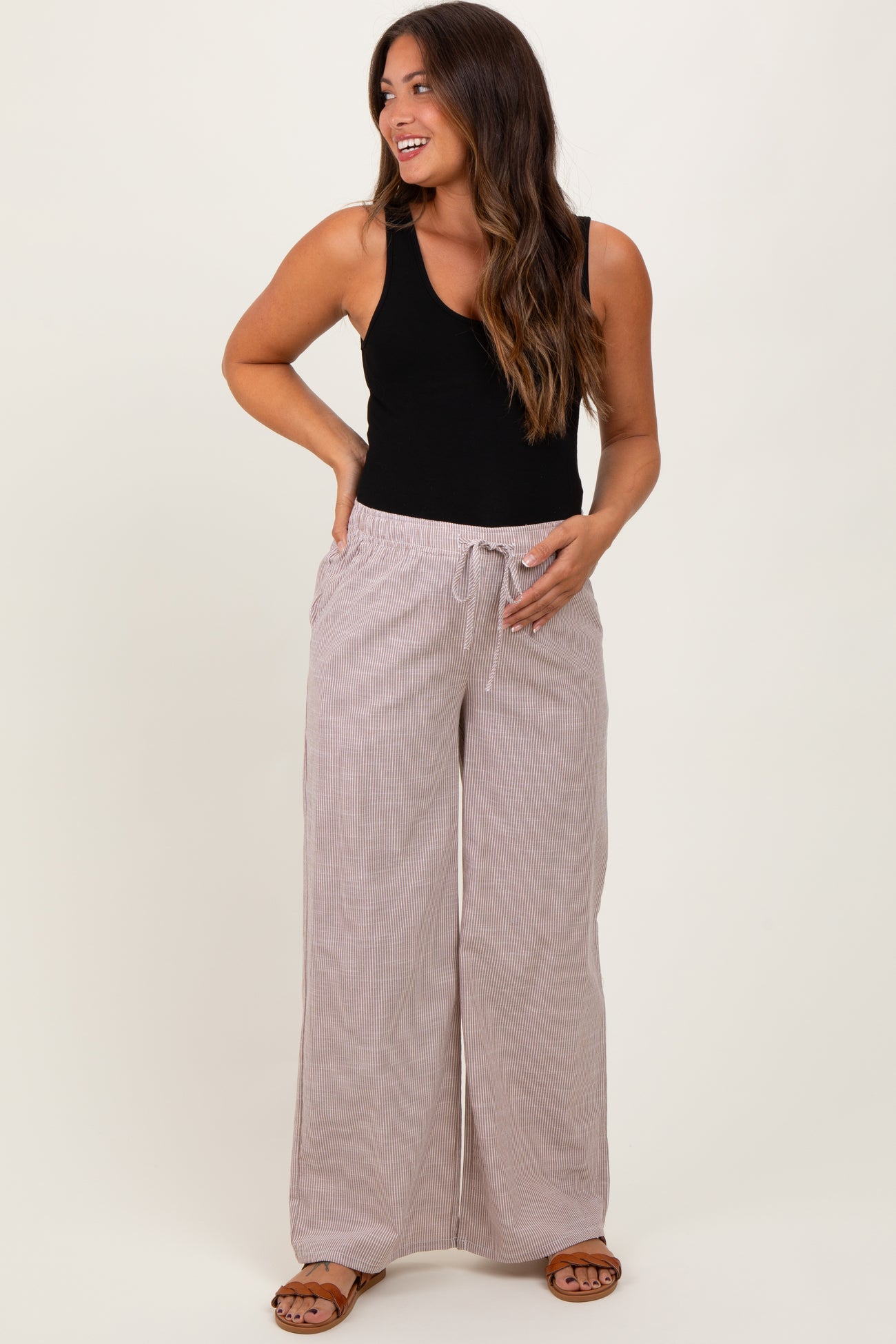 Light Taupe Striped Drawstring Wide Leg Maternity Pants