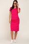 A sleeveless textured maternity dress featuring ruffle shoulder straps, a smocked top, a ruffle hem and a v-neckline.