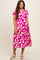 An abstract printed maternity dress with a split v-neckline, a knee-length hem, a collar, short cuffed dolman sleeves, and side pockets.