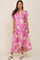 A printed maternity wrap dress with a crossover wrap front with tie and hi-lo ruffle hem with puff sleeves. Snap button closure on neckline. Dress is partially lined on top.