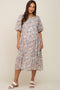 A leaf print maternity maxi dress that features a v-neckline, an adjustable tassel waist tie, and dolman half length sleeve.