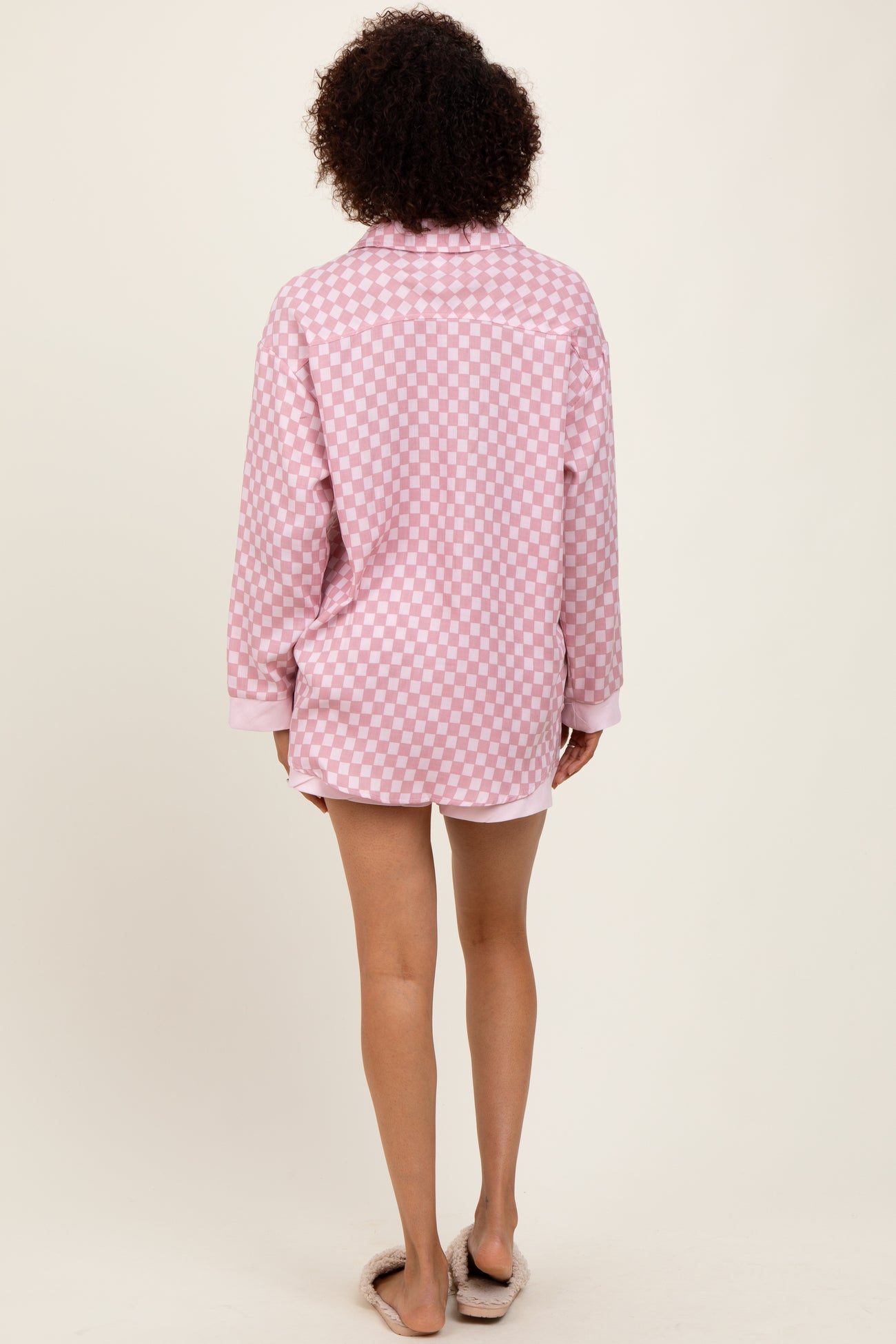 Relax in style with this Mauve Checkered Print Pajama Shorts Set. Featuring a soft, breathable fabric, this two-piece set includes a button-down long sleeve top with a classic collar and a contrast pocket, paired with matching shorts with a comfortable cuffed hem. The chic checkered pattern in soothing mauve tones adds a trendy touch to your loungewear collection. Perfect for cozy nights or casual mornings, this set offers a flattering, relaxed fit that keeps you comfy without sacrificing style. Easy to mix and match or wear together for an effortlessly cute look.