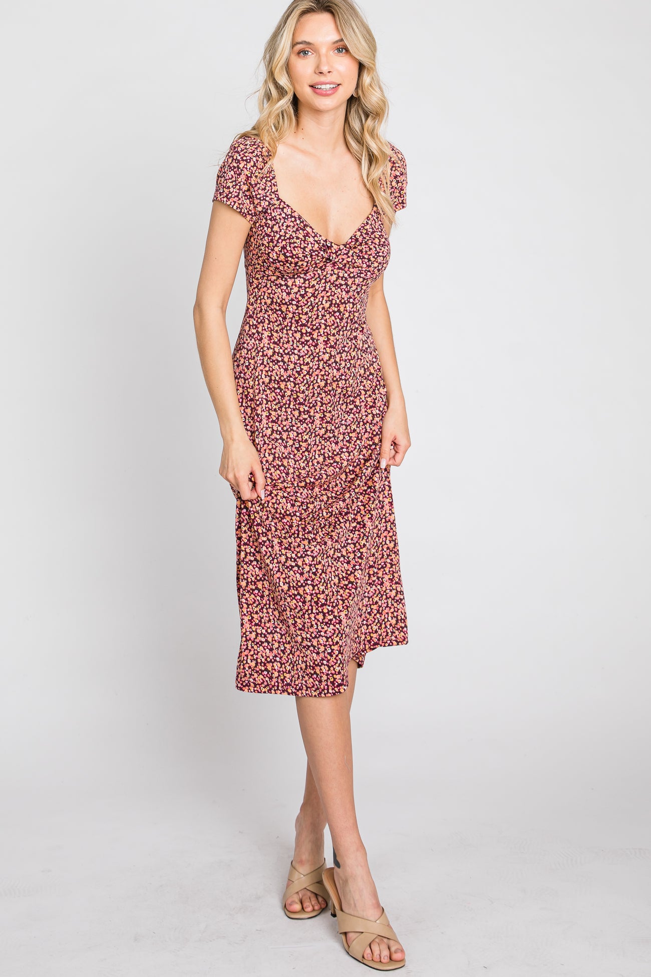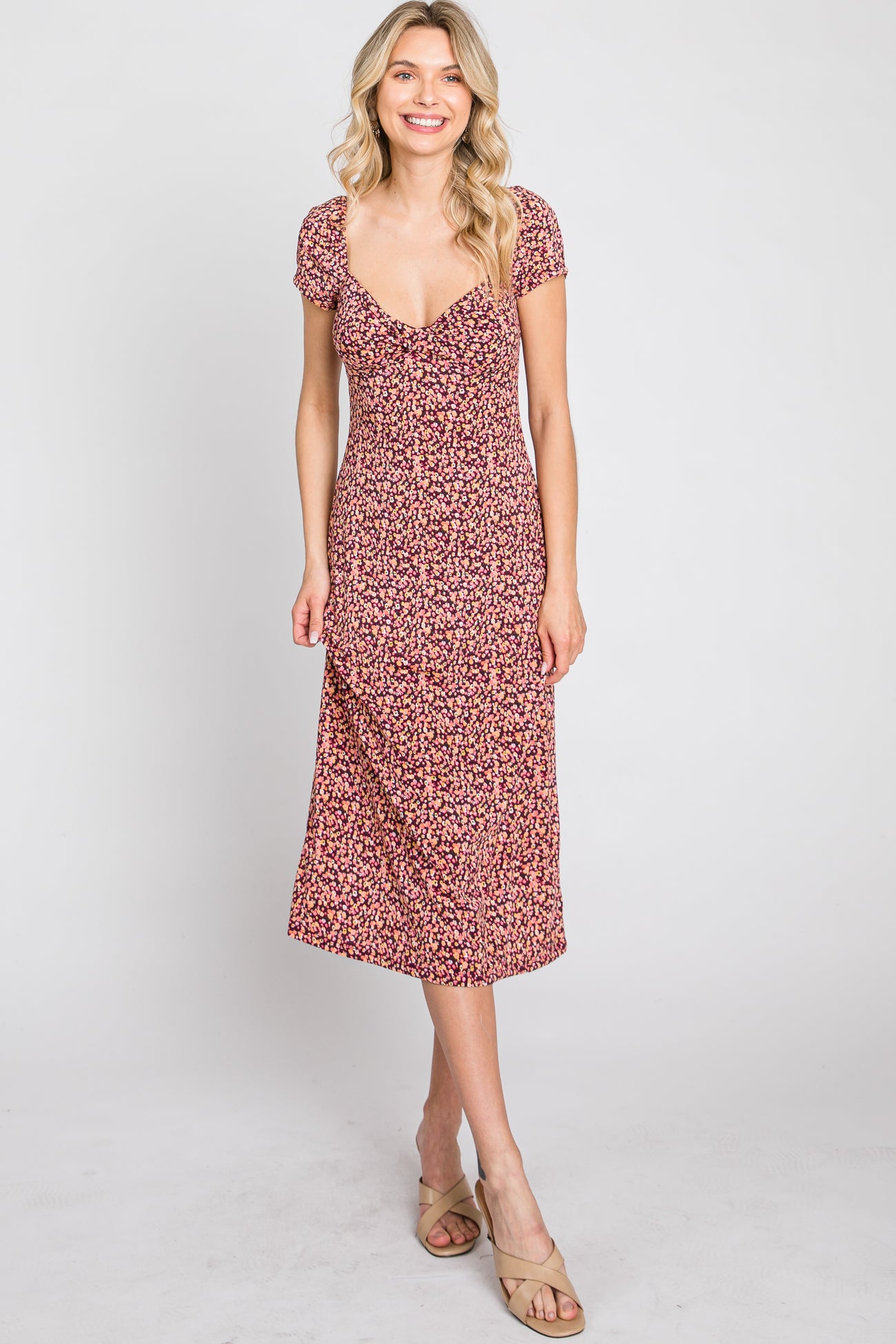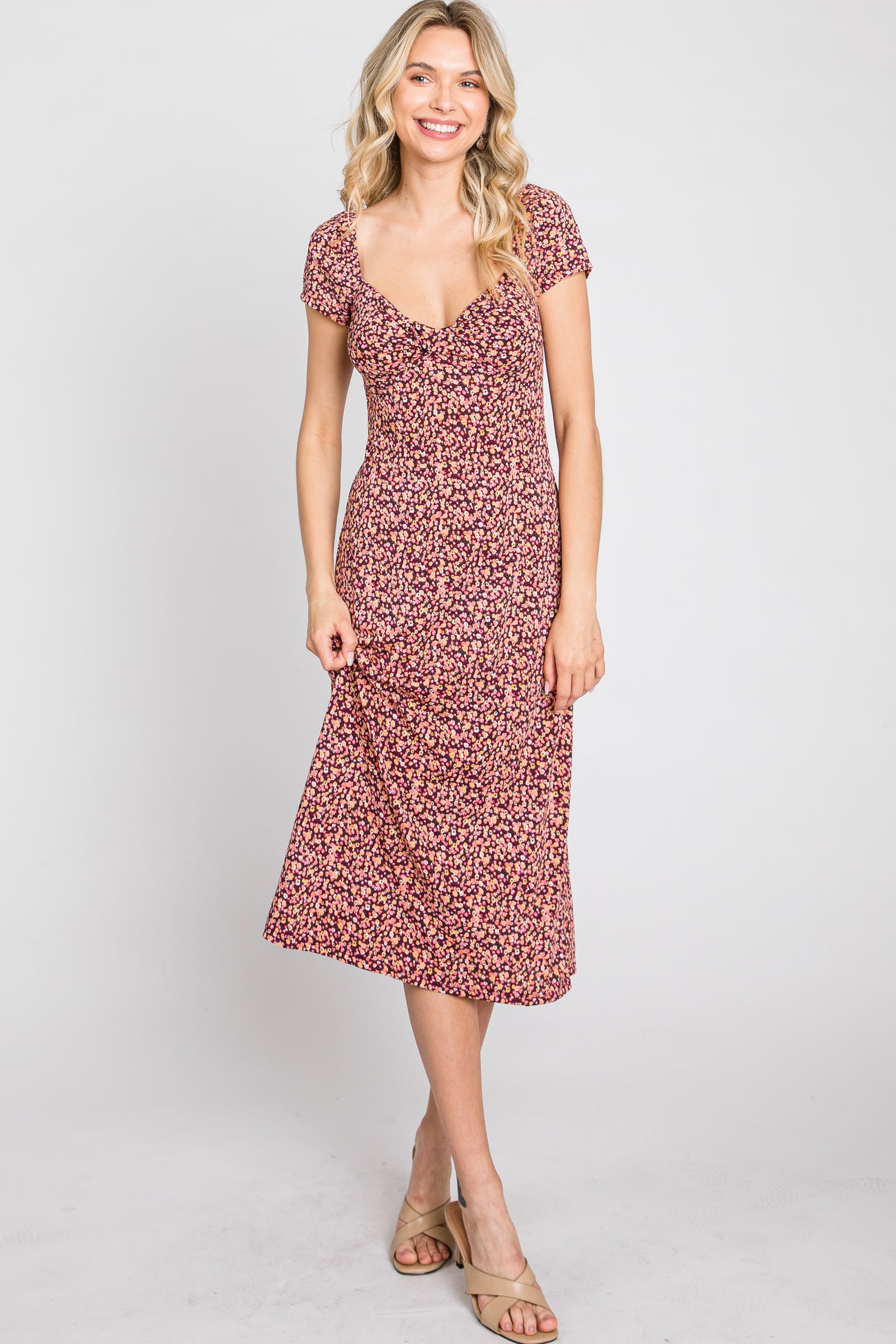 Details A floral midi dress with a sweetheart neckline and short sleeves. Content + Care