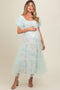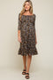 A printed maternity midi dress featuring a rounded neckline with an elastic band, short puff sleeves, a ruched waist with an elastic band and an A-line skirt.