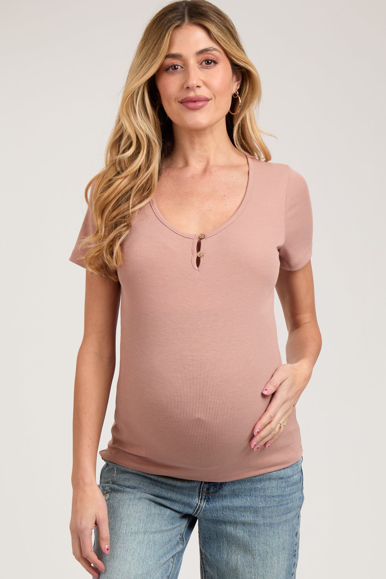 Mauve Ribbed Short Sleeve Button Maternity Top