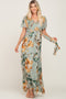 A maxi dress in lurex swiss dot material with wrap v-neckline, short sleeves and sash tie waist. Elastic waistline. Bust and skirt lined. Sleeves semi sheer.
