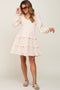 A maternity dress featuring a button down front, a tiered body, short puff sleeves, side pockets and a v-neckline.