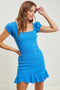 A solid dress with a v-neckline, long cinched sleeves, side pockets, and an elastic back waist. Body is lined.