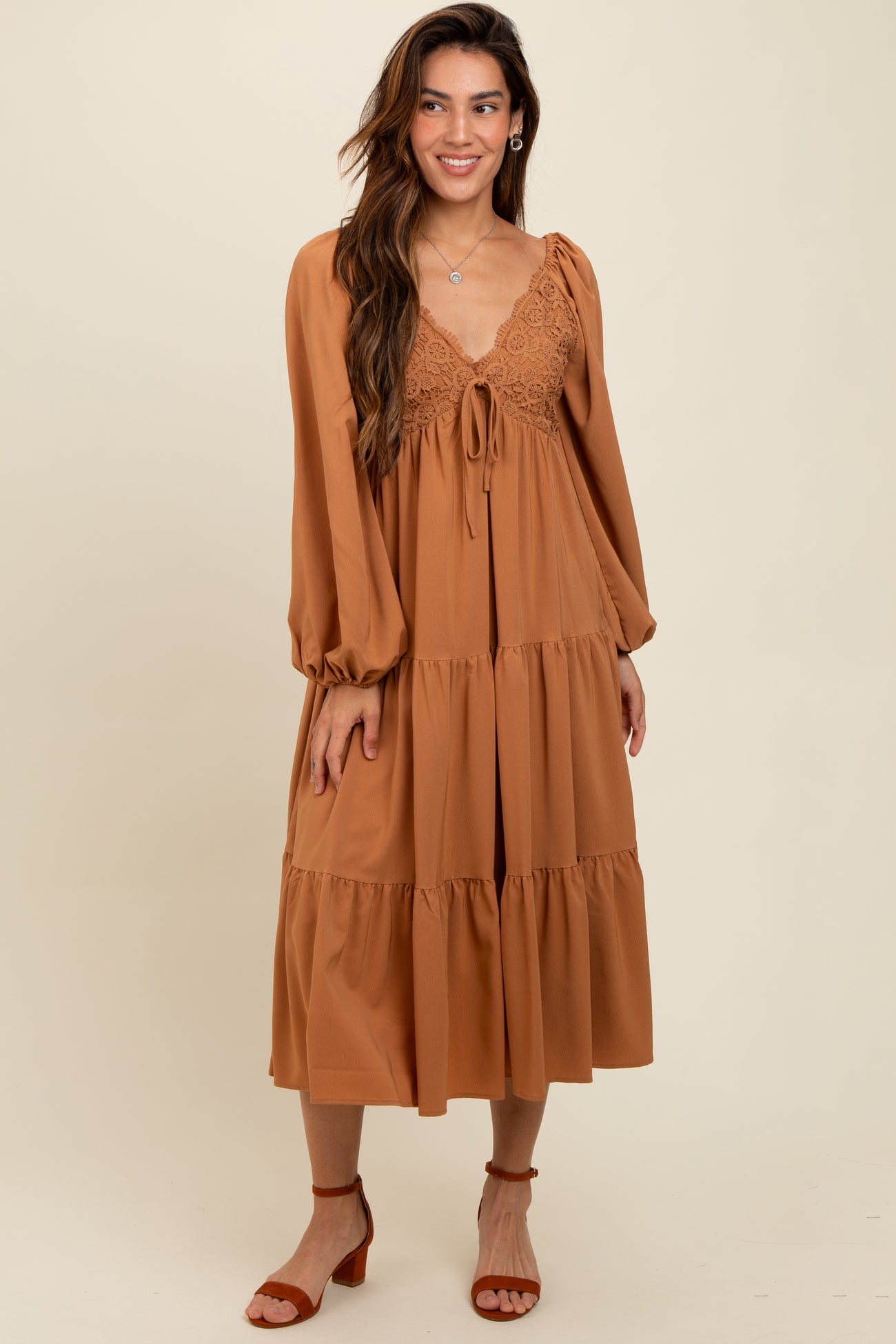 Mocha Contrast Lace Bodice Tiered Maternity Midi Dress