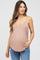 A solid hued maternity tank top featuring adjustable cami straps and a curved hem.