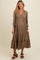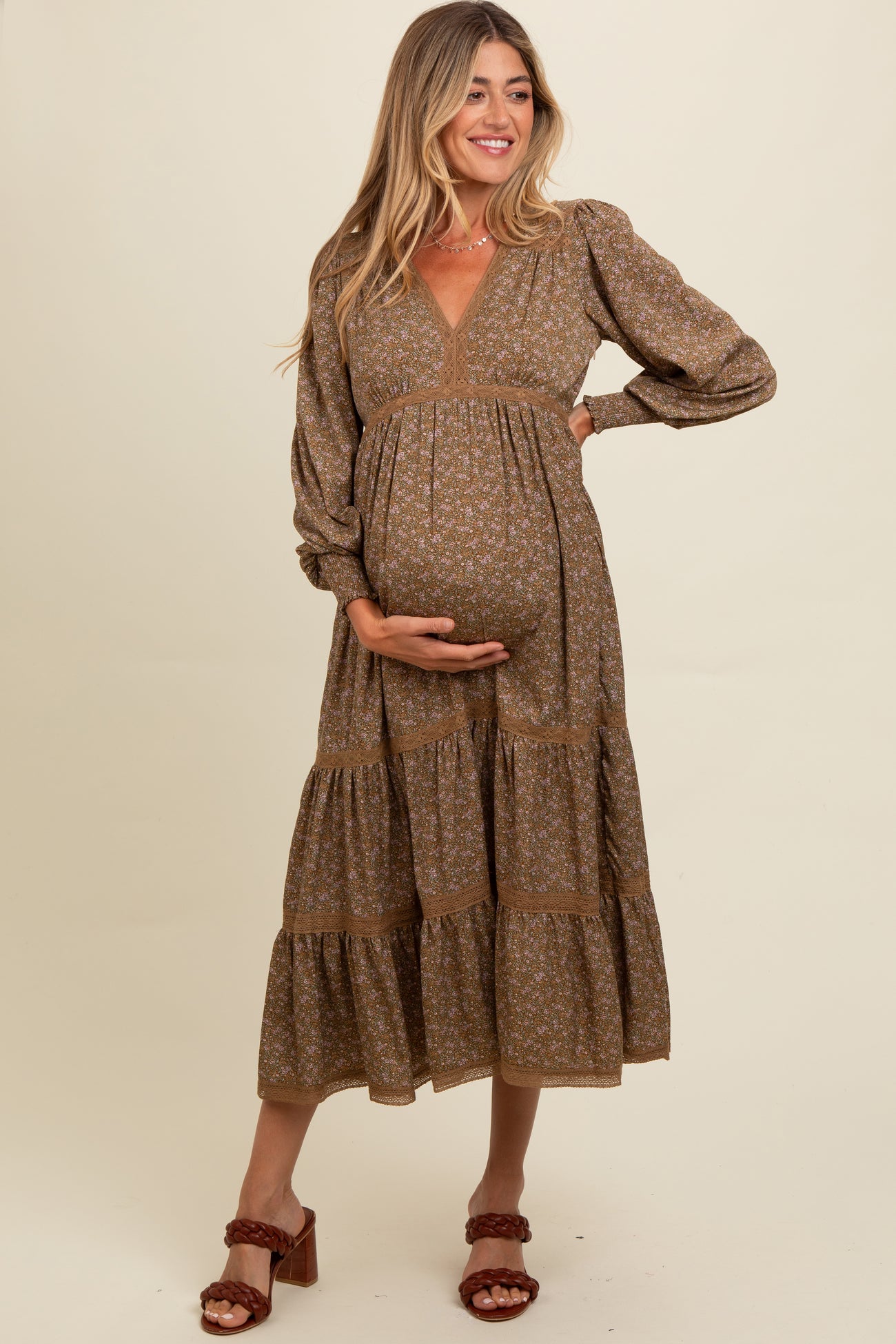 Mocha Floral Lace Trim Bubble Sleeve Maternity Maxi Dress