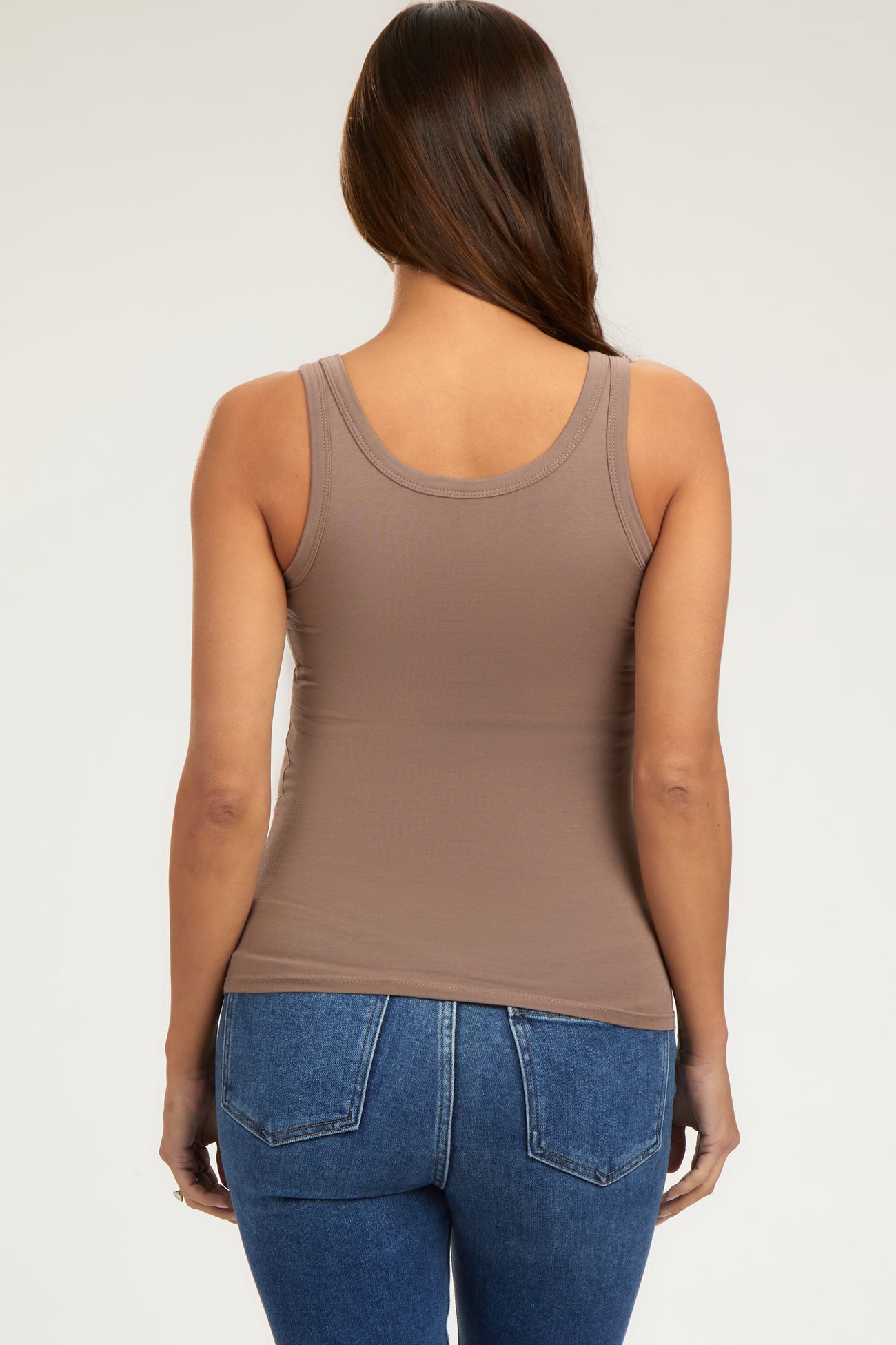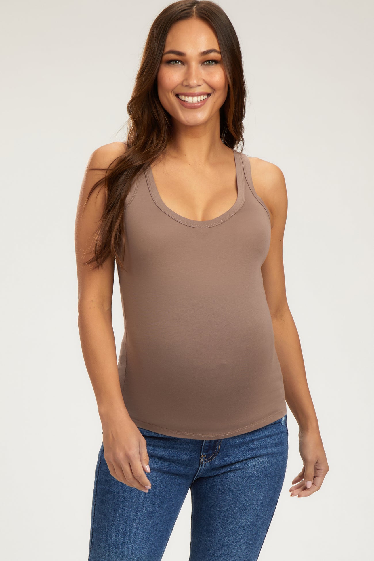 A solid, sleeveless maternity tank top with a scoop neckline.