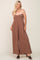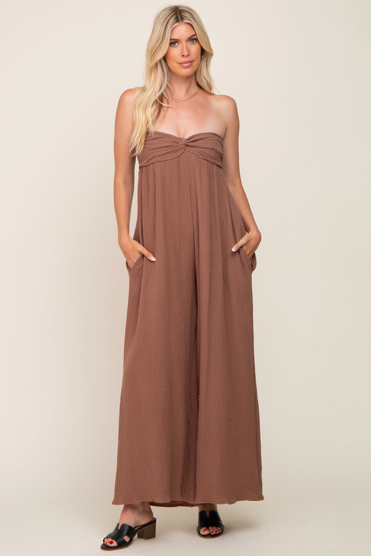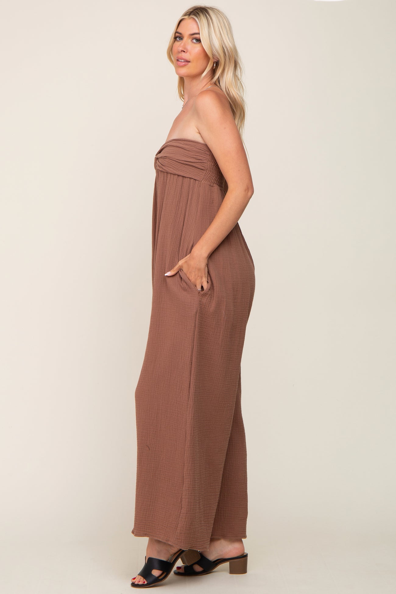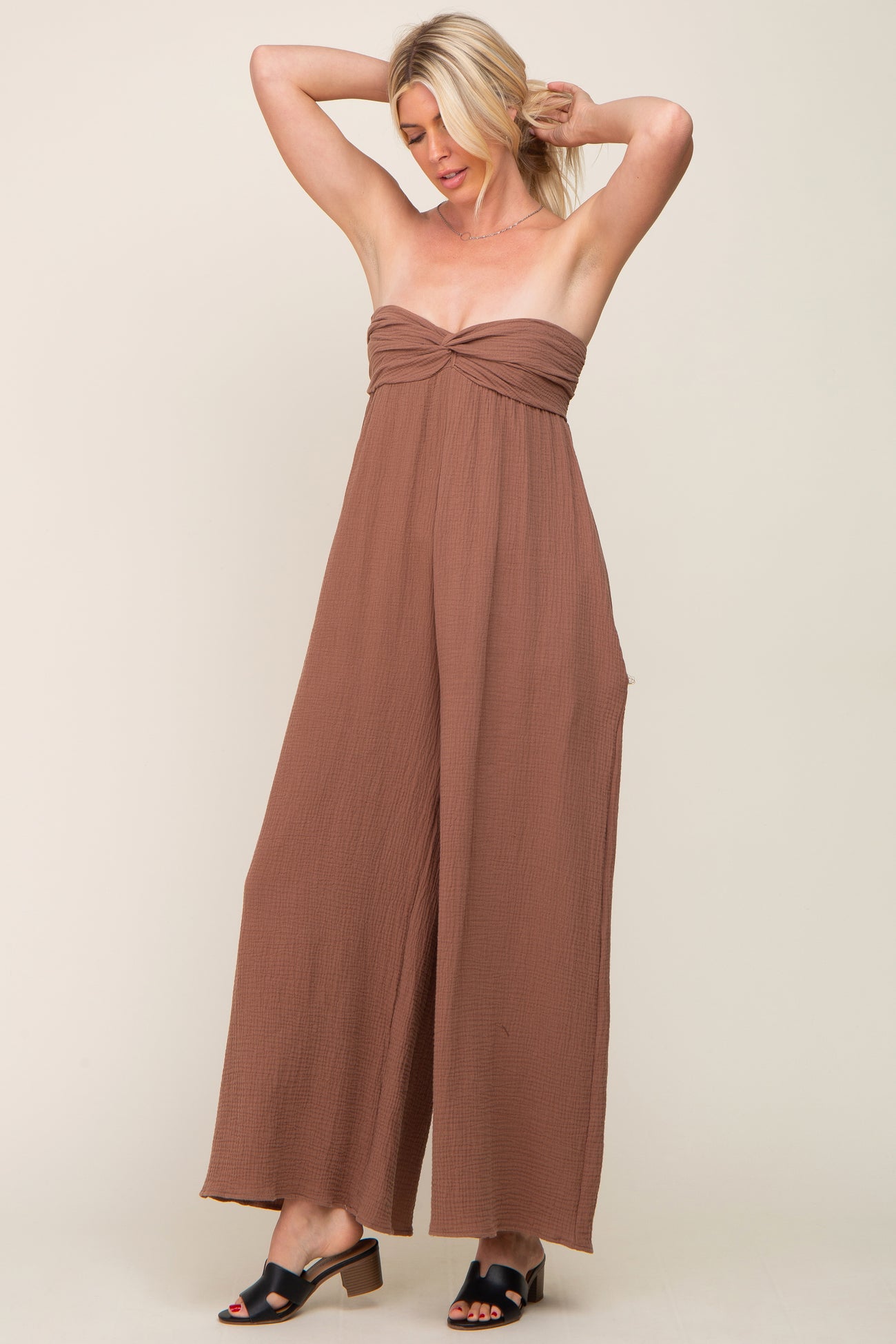 A knit jumpsuit that is strapless with a sweetheart neckline, front twist top, a smocked back, side pockets, and wide leg pants.