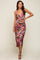 A floral midi dress featuring a wrap v-neckline, a wrap skirt, a ruched side, side slit, adjustable double straps, a lace-up back, and a side zipper closure.