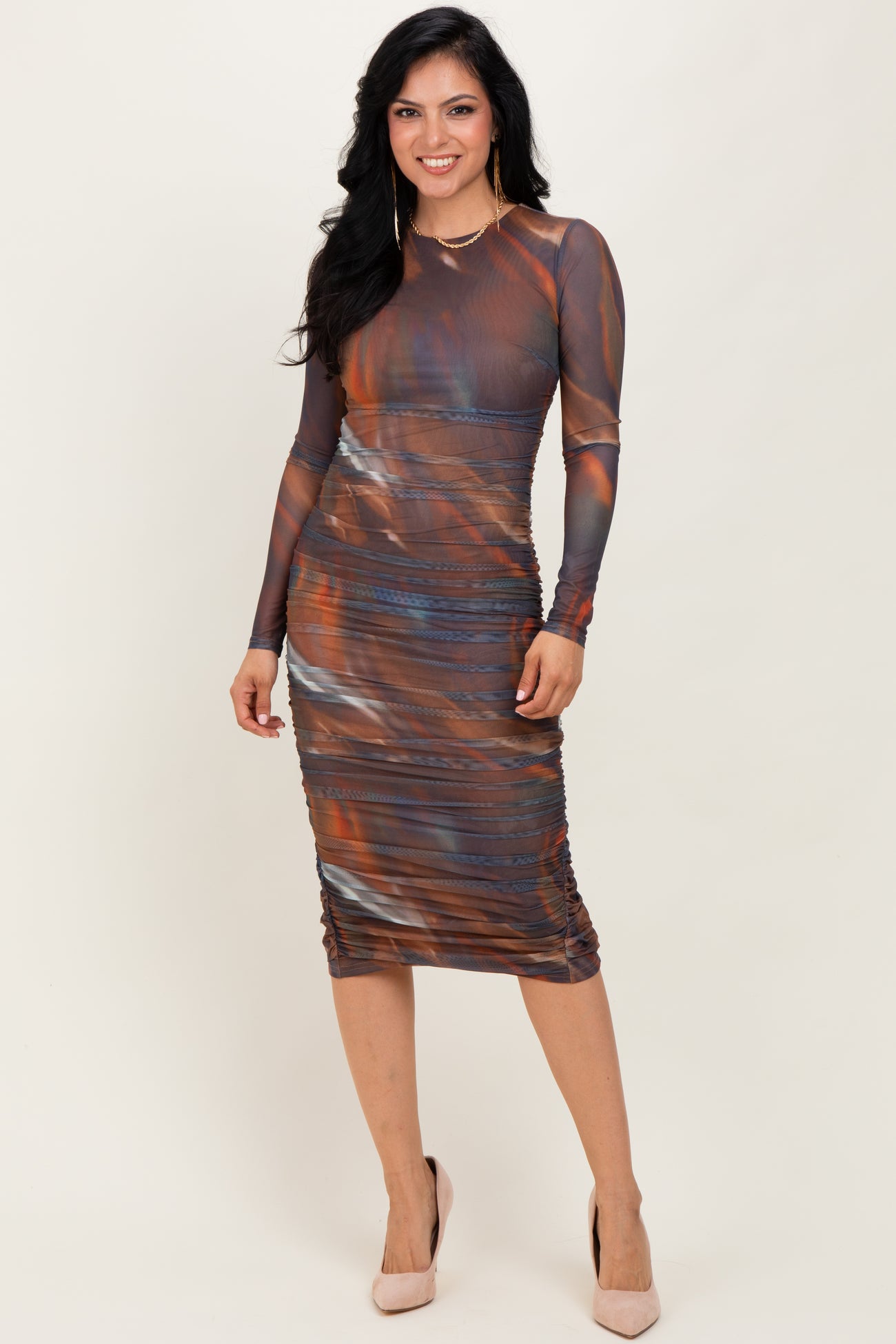 Turn heads with this Multicolor Printed Mesh Ruched Long Sleeve Midi Dress. Featuring a striking blend of earthy tones, this dress offers a unique, abstract print on sheer mesh fabric that hugs your curves beautifully. The ruched detailing along the sides adds texture and enhances your silhouette, while the long sleeves and high neckline provide a chic, sophisticated vibe. Perfect for evenings out or special occasions, this midi-length dress pairs effortlessly with your favorite heels. Embrace bold style and effortless elegance in one standout piece.