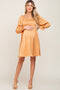 A floral print maternity chiffon dress with puff sleeves, sash tie waist and ruffle hem. Features metallic accent in fabric.