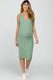 A printed lightweight maternity midi dress with button down closure and ruffle detail on neckline and hi-lo hem.
