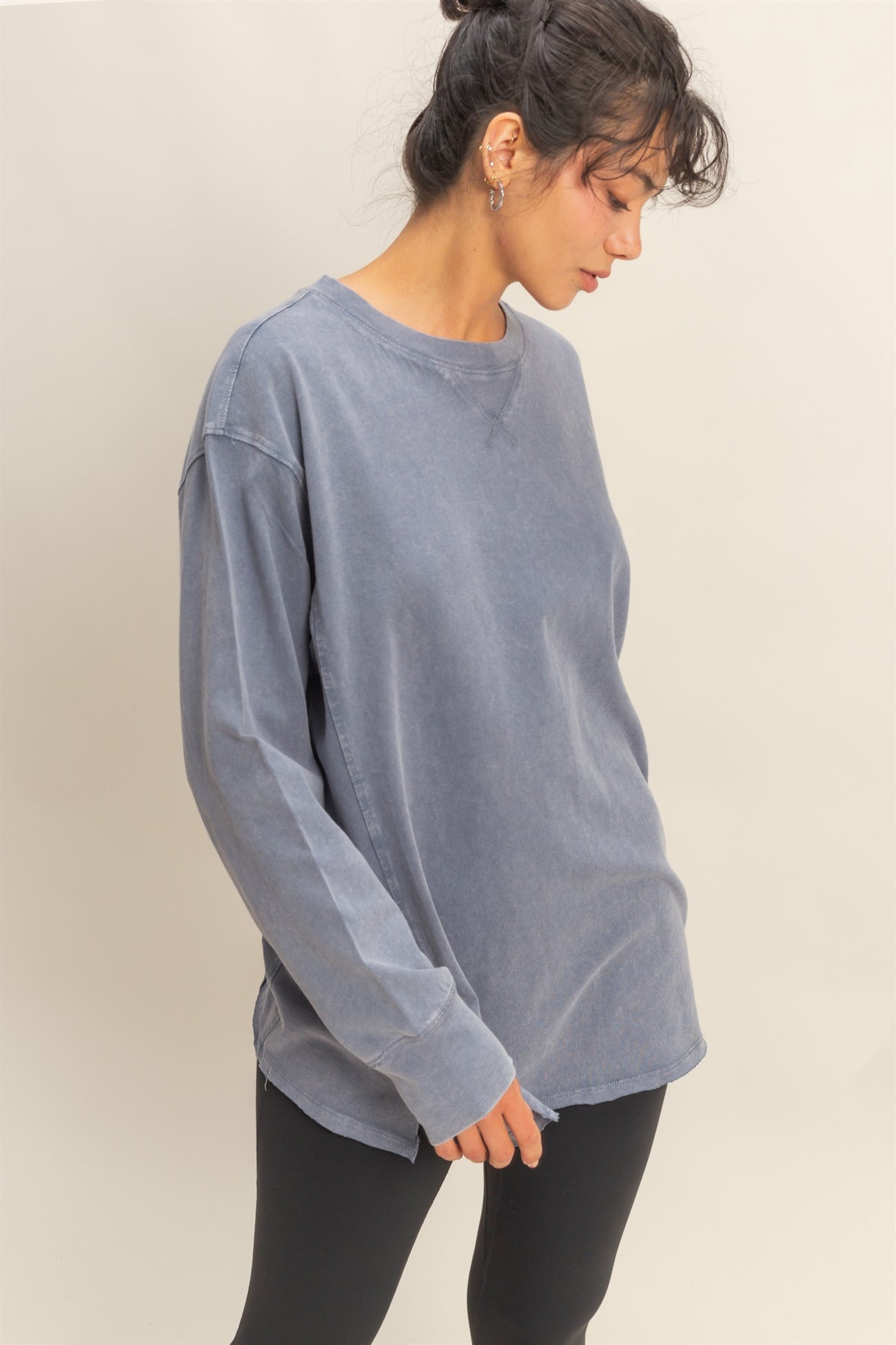 Navy Mineral Washed Drop Shoulder Long Sleeve Maternity Top