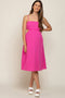 A maternity midi dress featuring a slight sweetheart neckline, a front tie accent, shirred bodice, short puff sleeves, side pockets and a tiered skirt.
