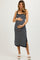 A striped sleeveless maternity dress featuring a side slit and a square neckline.