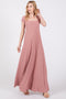 A textured sleeveless maxi dress featuring ruffle shoulder straps, a scoop back, a front ruffle slit and a rounded neckline.