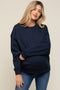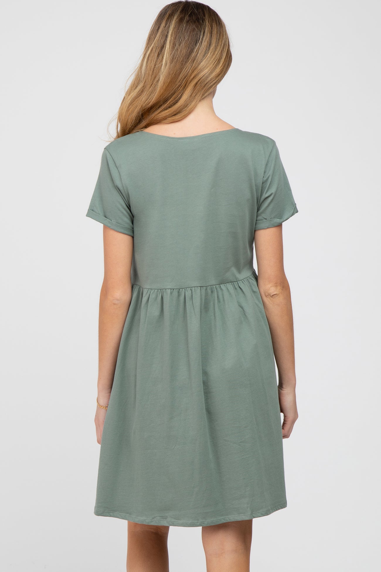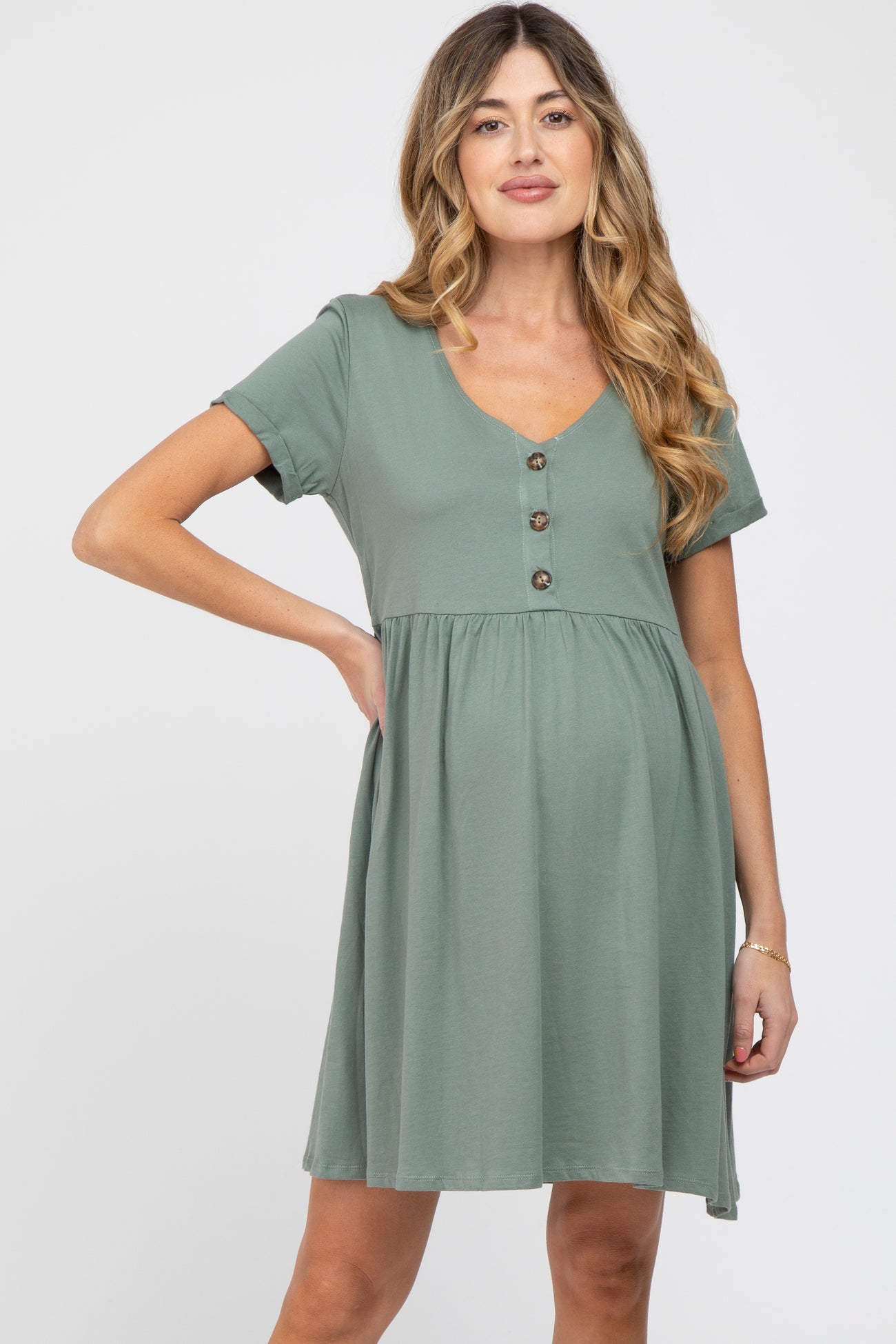 A solid short maternity dress with a button up front and rolled cuff sleeves.